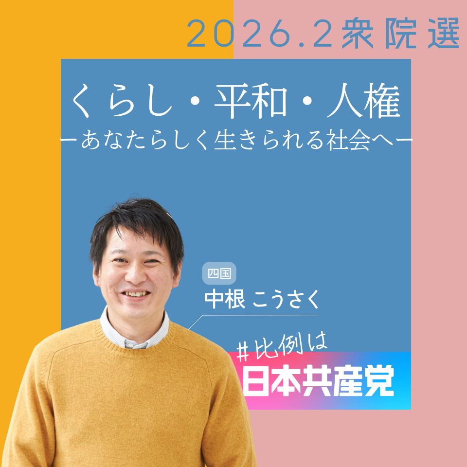 特集一覧へ news 最新のお知らせはこちら 衆院四国比例候補が決定 中根耕作さん 2026.01.27 選挙 日本共産党高知県委員会は12月15日、次期衆議院選挙の四国比例代表の予定候補として中根耕作さんを発表しました。中根さんは2022年の総選挙でも四国比例候補を務め、その後高知地区委員会で地区副委員長として役割を果たしてきました。白川よう子さんが勤めてきた四国比例候補を引き継いでの挑戦です。 **** お知らせ一覧へ